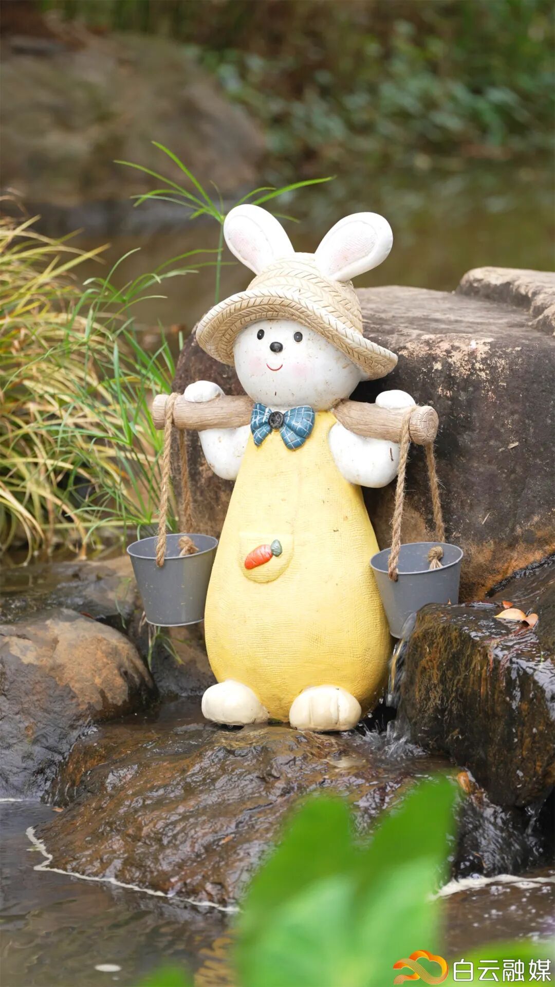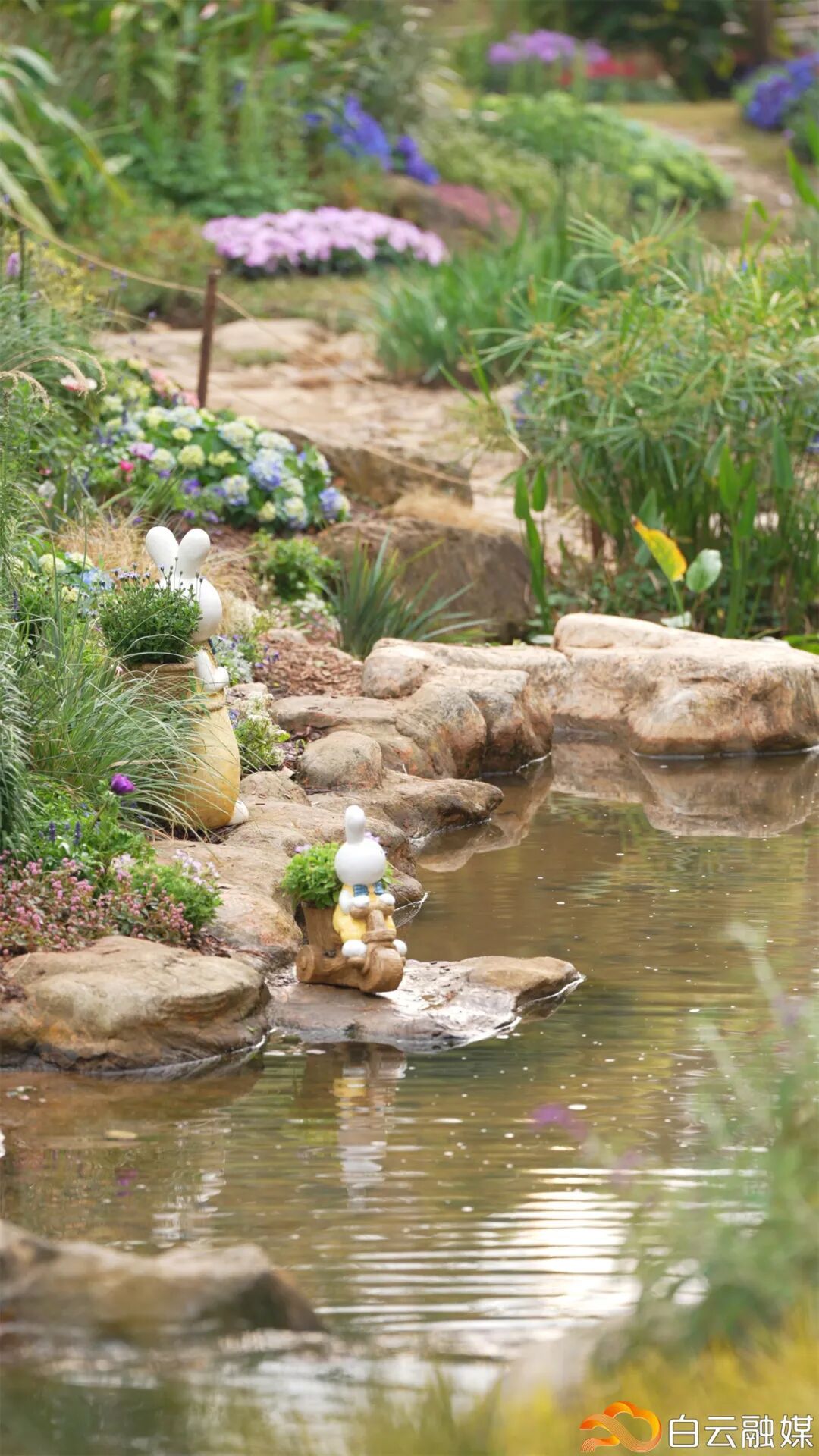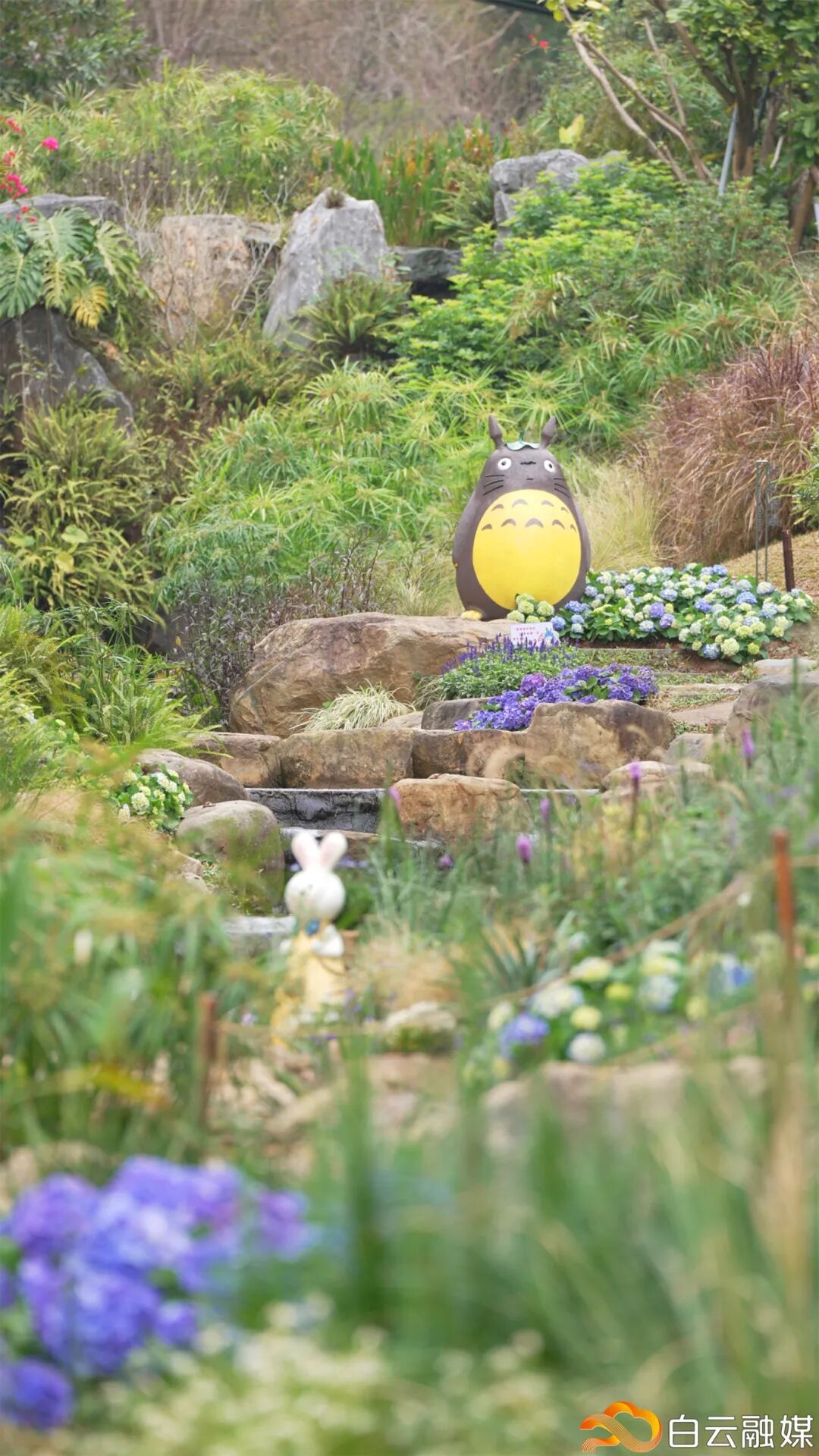 “溪谷紫韵”中的“绿野仙踪”,则将自然野趣与童话梦境融为一体。溪水潺潺,苔痕青青,蓝紫粉白的绣球花簇拥岸边,小兔、龙猫等动漫小品藏身其间,仿佛宫崎骏笔下的秘境跃入现实。
