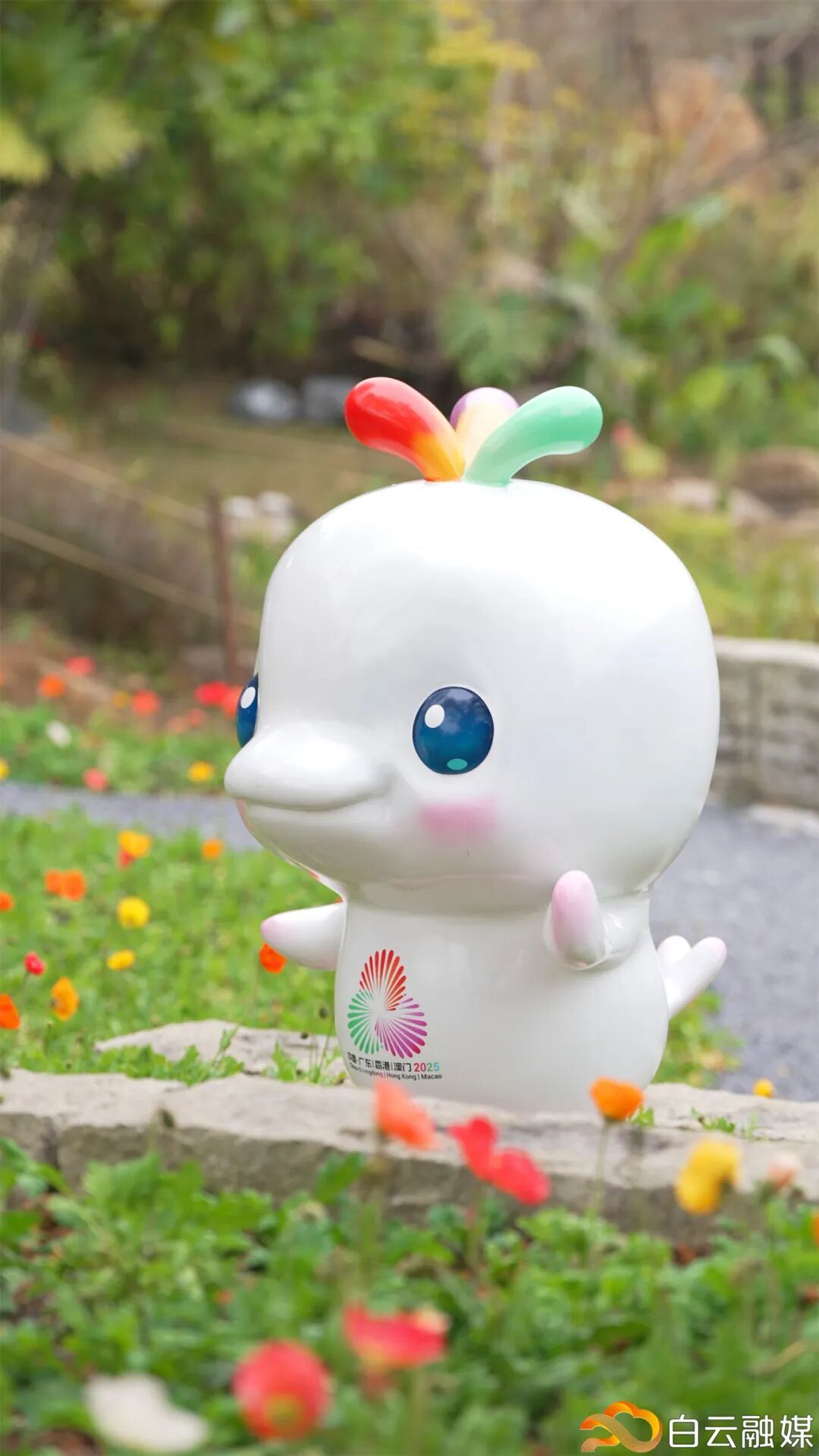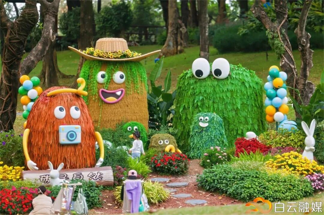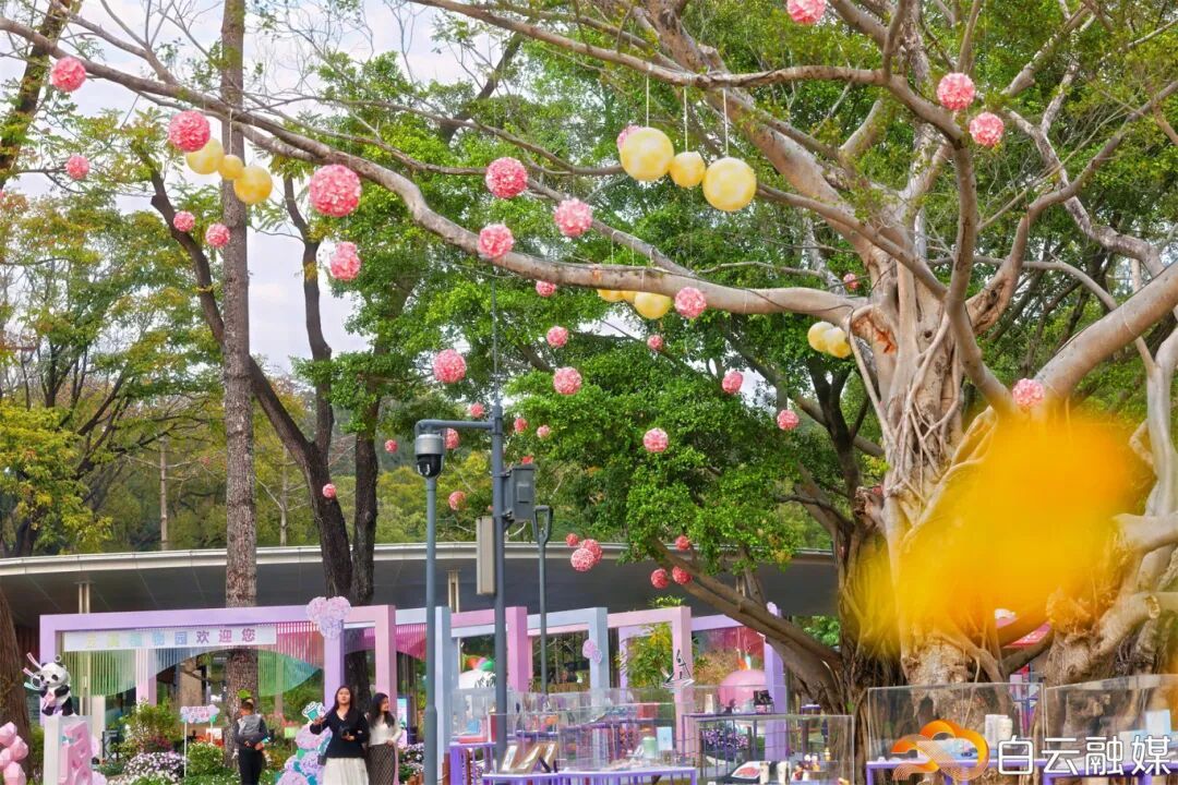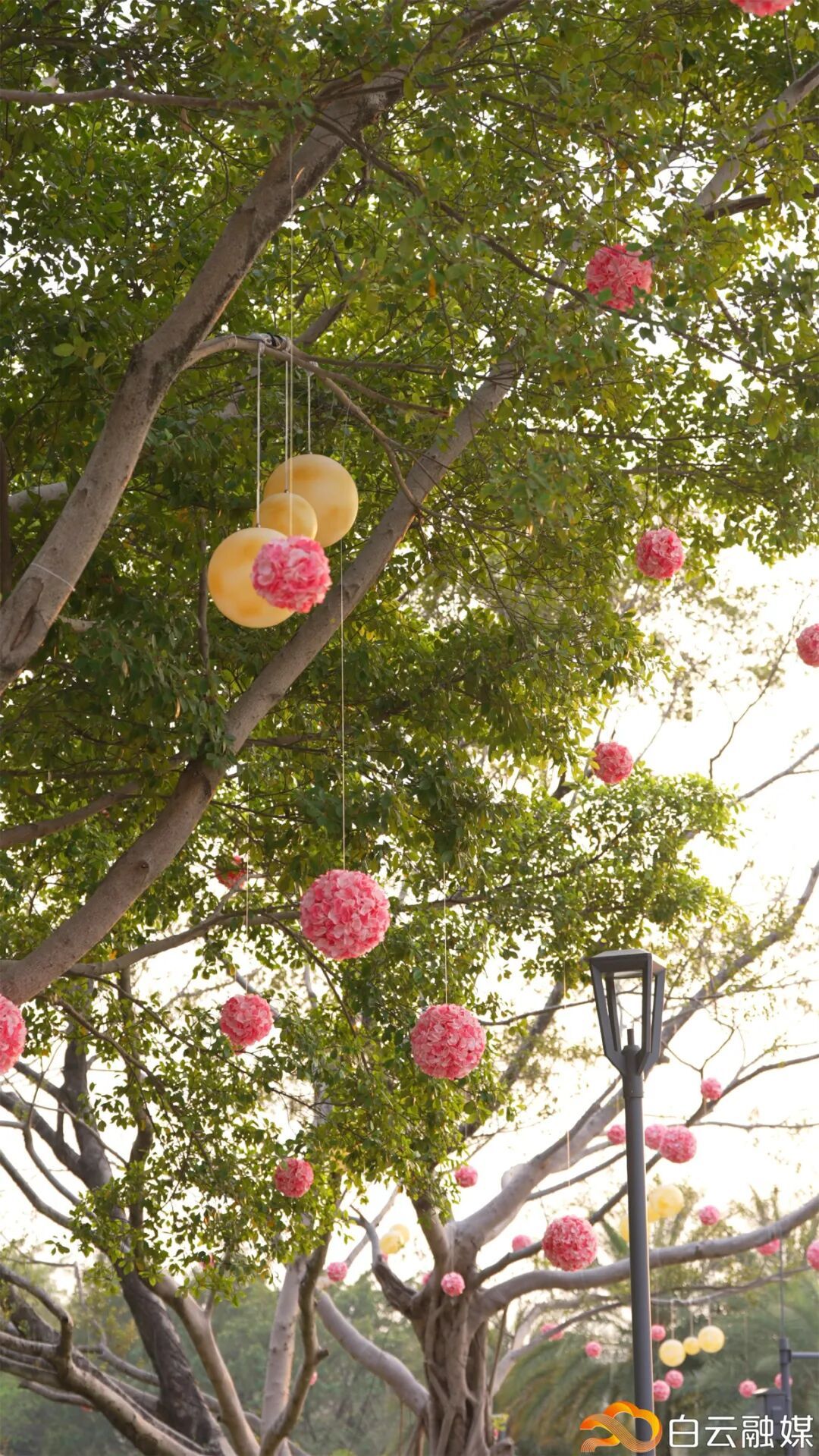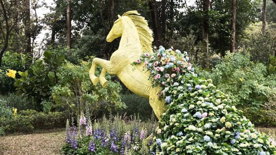 步入云溪广场,浪漫便扑面而来。以粉为主调的绣球花带延展成“一路生花”,与粉色绣球、黄色星球挂饰交相辉映,织就一个被温柔包裹的春天。沿主干道前行,“花开纳福”中的“马上有钱”场景格外吸睛——一匹披绿的马背上,绣球如瀑倾泻,引得游人纷纷驻足留影。